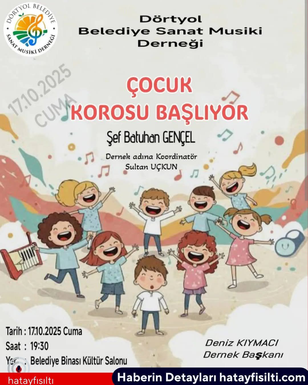 Dörtyol Belediyesi, 17 Ekim 2025 Cuma akşamı düzenlenecek özel etkinlikle çocuklara keyifli ve sanat dolu anlar yaşatacak. Sınırlı kontenjanla gerçekleşecek programda müzik ve neşe bir araya gelecek.