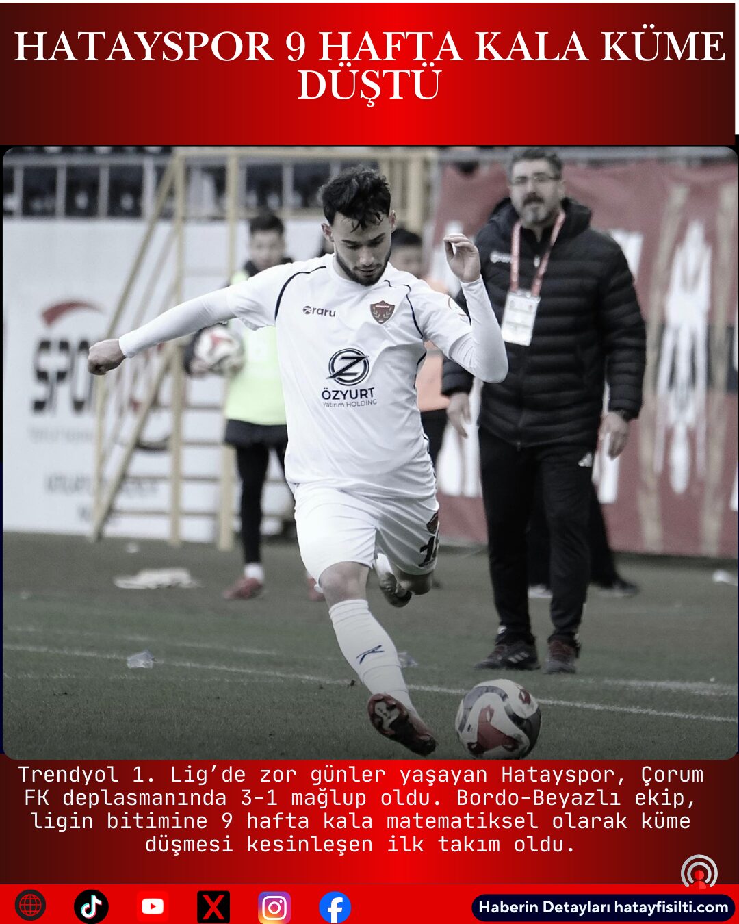 Trendyol 1. Lig’de zor günler yaşayan Hatayspor, Çorum FK deplasmanında 3-1 mağlup oldu. Bordo-Beyazlı ekip, ligin bitimine 9 hafta kala matematiksel olarak küme düşmesi kesinleşen ilk takım oldu.